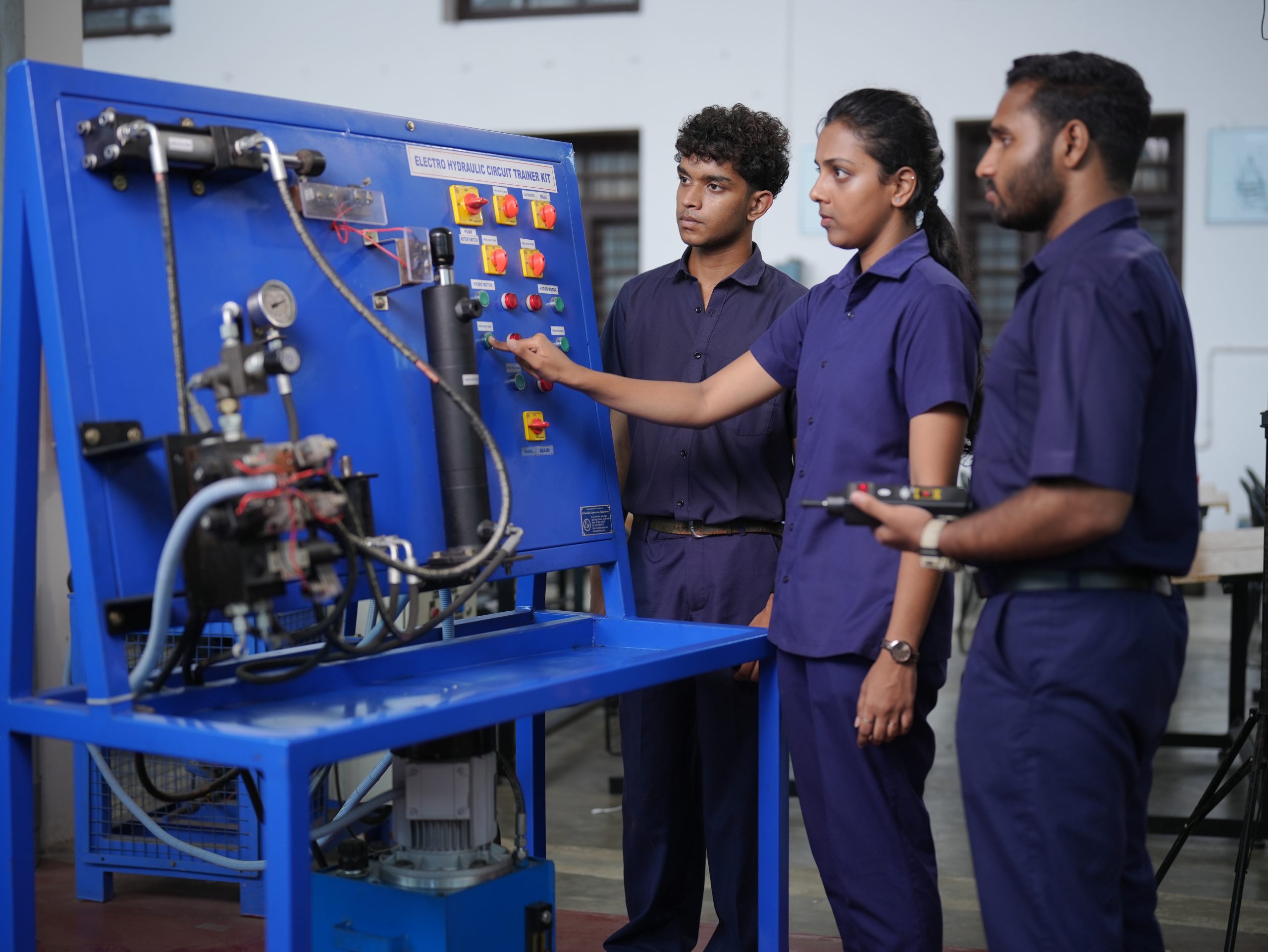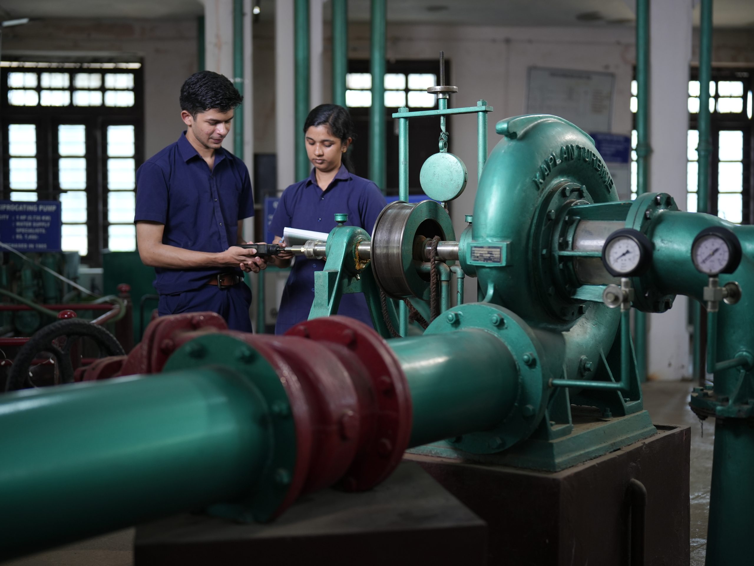 • Hydraulic Machines Section:   Students are exposed to technical aspects of Hydraulic turbines such as Kaplan turbine, Francis turbine, and Pelton Wheel, and Pumps such as Centrifugal pump, Self-priming pump, Reciprocating pump, Gear pump, Hydraulic ram, etc. besides doing experiments to analyse the performance characteristics of these machines.