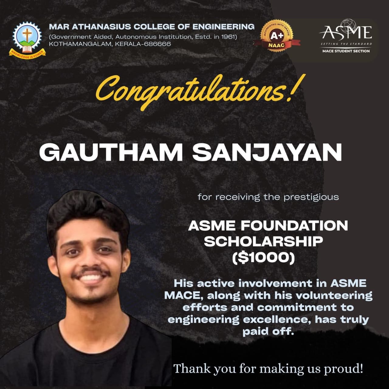 Gautham Sanjayan, an active member of the ASME MACE Student Section, has been honored with the ASME Foundation Scholarship valued at $1000. This prestigious recognition is awarded to student members of the American Society of Mechanical Engineers (ASME) who have demonstrated outstanding leadership, volunteerism, and a commitment to advancing engineering excellence. Gautham’s consistent dedication to ASME MACE, along with his involvement in technical and community-oriented initiatives, played a vital role in earning this international scholarship.