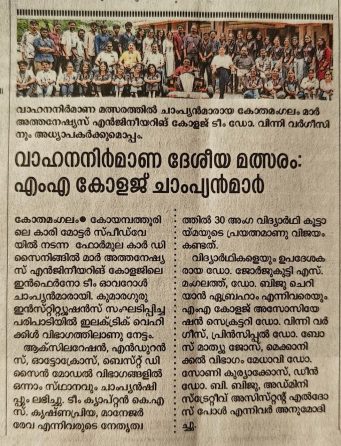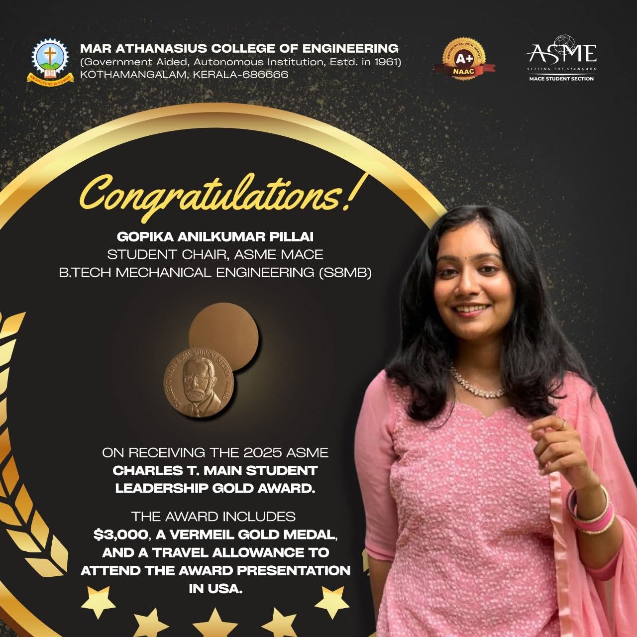 Gopika Anilkumar Pillai, Student Chair of ASME MACE and a final-year B.Tech Mechanical Engineering student (S8MB) at Mar Athanasius College of Engineering (MACE), Kothamangalam, has been awarded the highly esteemed 2025 ASME Charles T. Main Student Leadership Gold Award. This prestigious international honor recognizes outstanding leadership and exceptional service to the American Society of Mechanical Engineers (ASME) by student members across the globe. Gopika’s selection for this award is a proud moment for the entire MACE community and speaks volumes about her dedication, leadership qualities, and commitment to engineering excellence. The award includes a $3,000 cash prize, a Vermeil Gold Medal, and a travel allowance to attend the award presentation ceremony in the USA.